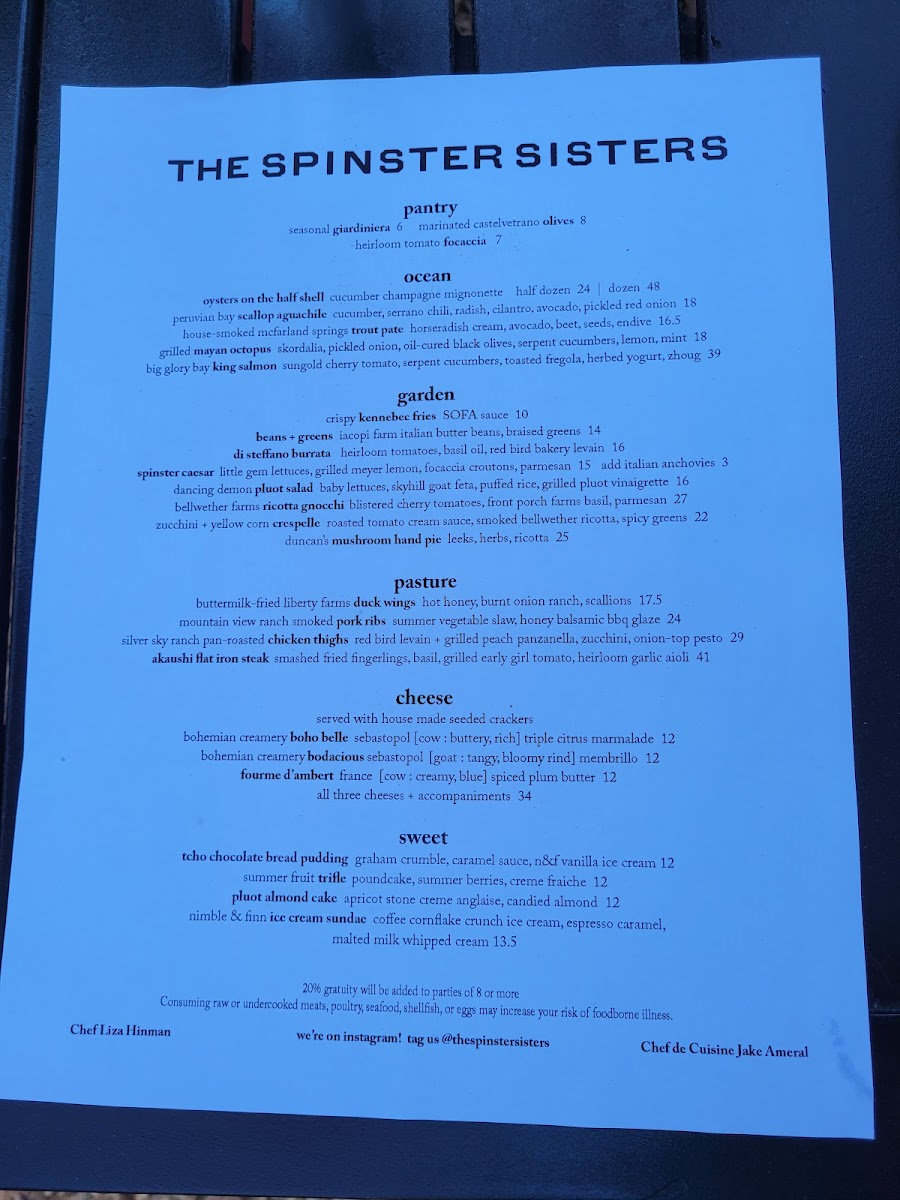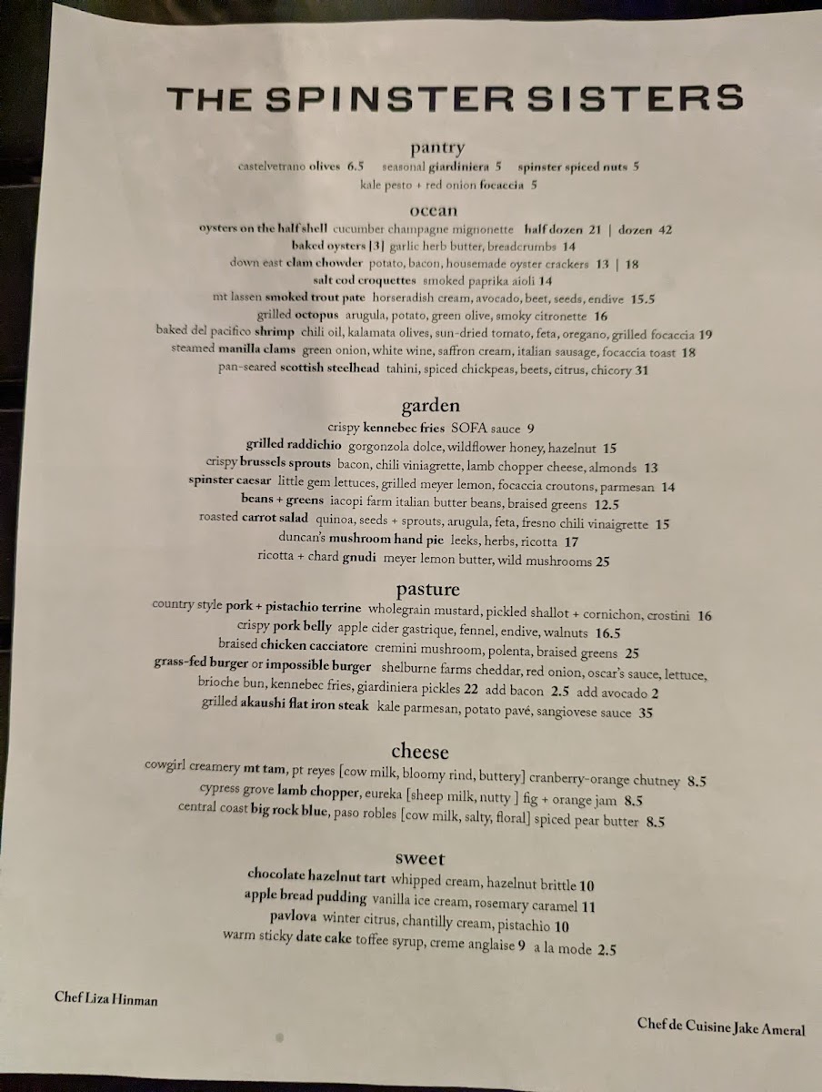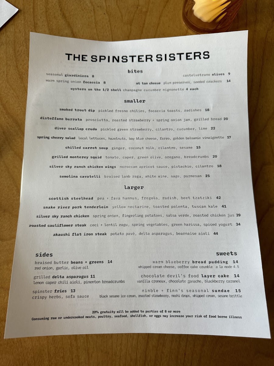The Spinster Sisters embraces locally sourced ingredients, showcasing the best of what Californian farms have to offer. As you peruse the menu, you’ll be enticed by an array of dishes that cater to both adventurous eaters and comfort food aficionados alike. Begin your journey with their pantry offerings, such as the lively marinated Castelvetrano olives and seasonal giardinier, both perfect for stimulating your palate.